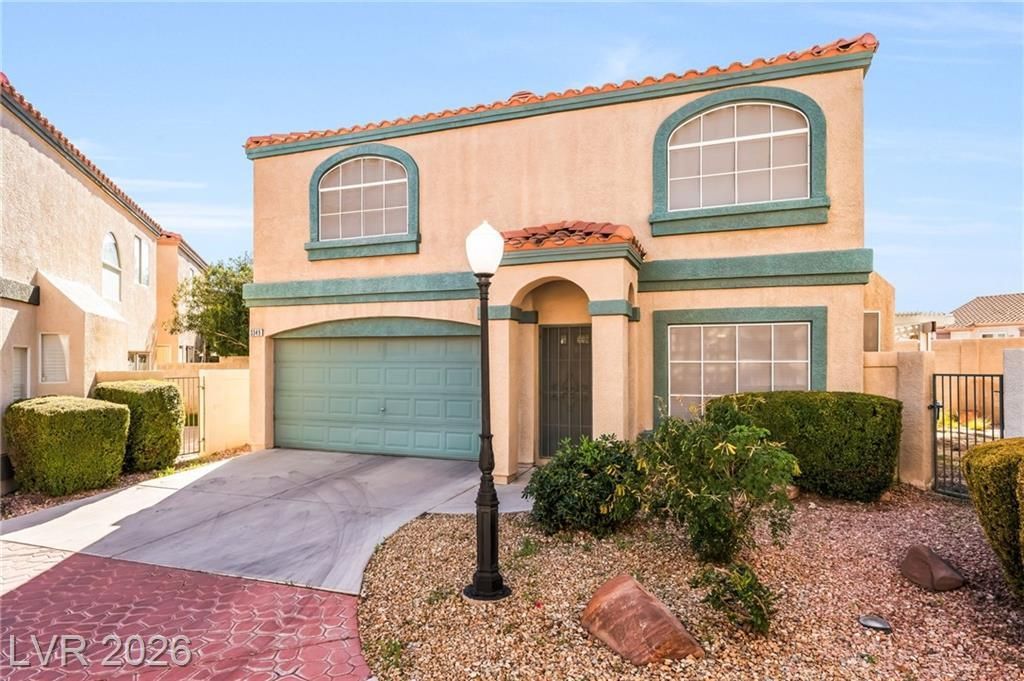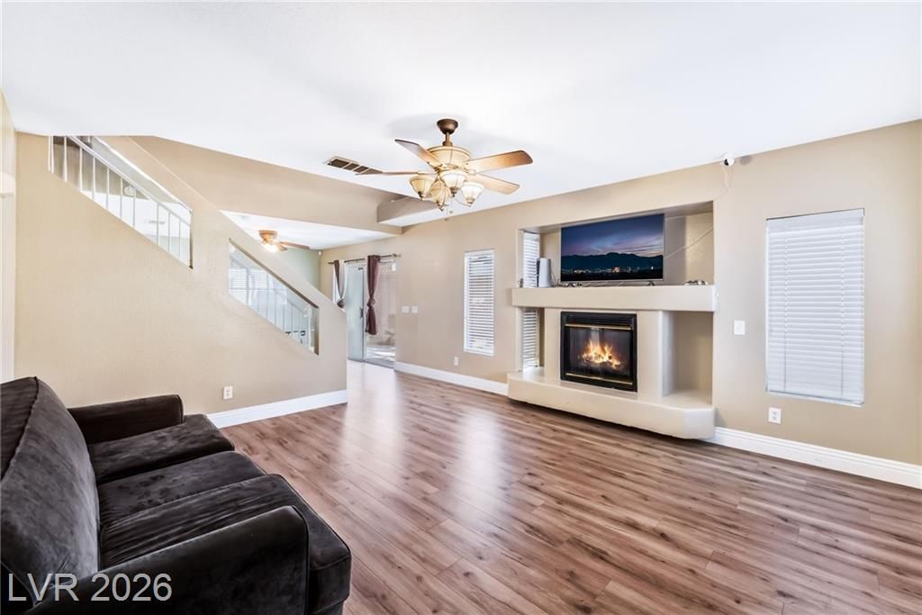This cozy home is conveniently located right near Cheyenne & Rampart. When you enter the gated community you feel the friendliness in the neighborhood & can enjoy all the green mature landscaping & tall trees. As you enter the home you will see the luxury vinyl plank flooring that was installed within the last 2 years, nicely painted accent walls & the fire place in the living room. The kitchen has upgraded black quartz counter tops & lots of counter space. Make your way upstairs and you will find a loft with a custom entertainment center & a spacious primary bedroom. The back yard has a patio cover, two tall palm trees & is easy to maintain. It also faces West providing a partial sunset view. The roof was completely re-done in January 2026. The A/C unit is only 2 years old & the water heater is only roughly 3 years old. The community has 2 pools & a walking path with various exercise stations for your use.