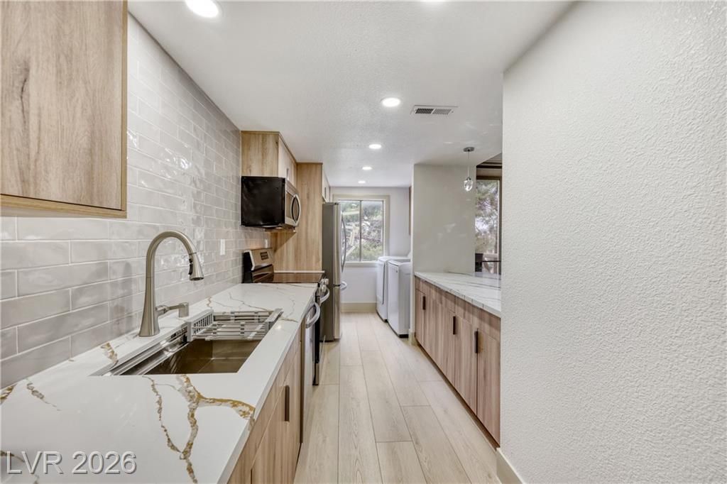 a premier 55+ guard-gated community This beautifully upgraded 2-bedroom, 2-bath condo features new hardwood flooring, fresh paint, stainless steel appliances, and upgraded countertops. Enjoy private balconies, with stunning Strip views. . Community amenities include 24/7 security, pool, spa, tennis courts, clubhouse, BBQ areas, and elevator access from your assigned underground parking space. Mature landscaping offers a peaceful retreat. No rentals or pets allowed, ensuring a quiet, owner-occupied lifestyle. Don't miss It !!!!!